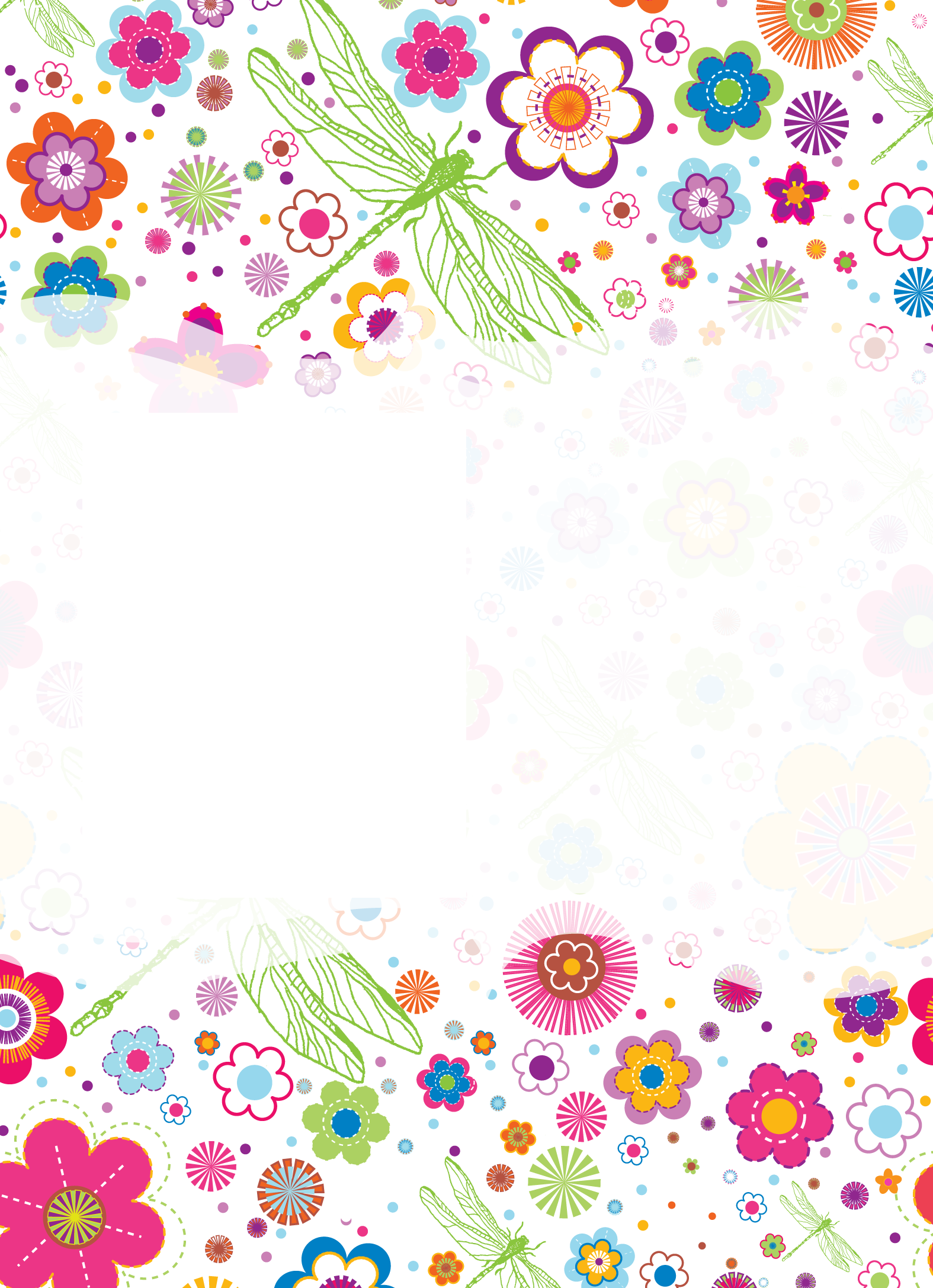 Delightful dragonflies are incorporated into a collage of colors and blooms in this eye-catching design. Whether you use the design for birthday invitations or birth announcements, your news will surely catch their attention.